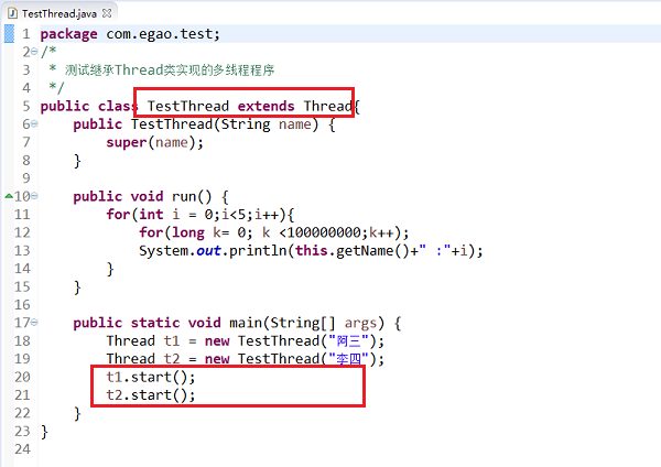 第一步我们在TestThread类中继承Thread,成为线程类,重写run方法,在main方法中创建线程对象,通过 t1.start(); 进行启动线程,如下图所示: