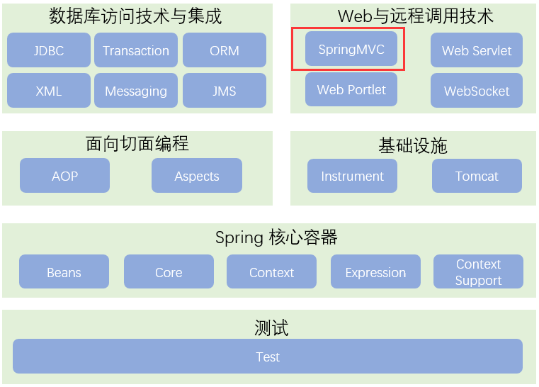 下图为Spring核心模块,其中SpringMVC模块位于Spring框架的Web模块部分