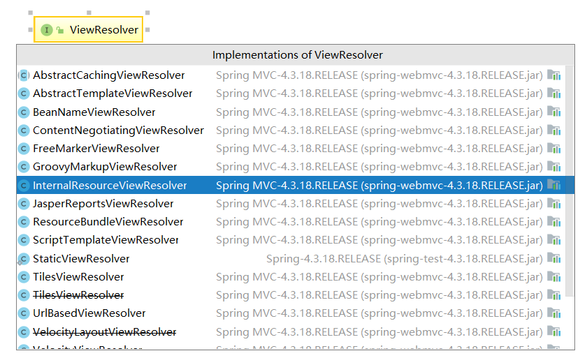 ViewResolver接口主要作用是解析DispatcherServlet传递的逻辑视图名,并将解析结果传回给DispatcherServlet。实现该接口的相关类或接口共有19个。