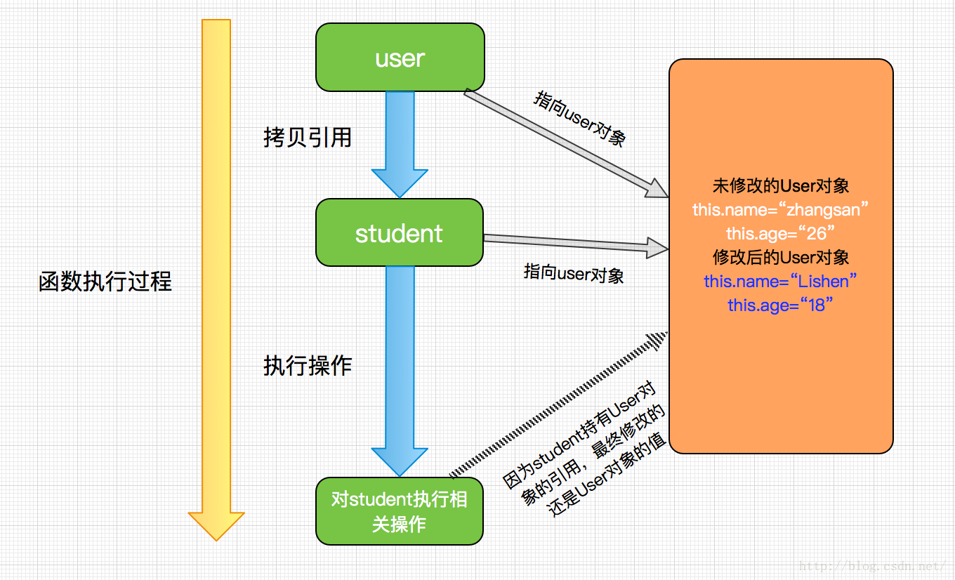很显然,User的值被改变了,也就是说方法参数类型如果是引用类型的话,引用类型对应的值将会被修改,下面我们来分析一下这个过程: