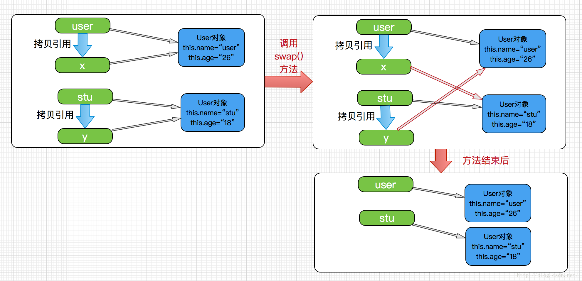 我们发现user和stu的值并没有发生变化,也就是方法并没有改变存储在变量user和stu中的对象引用。swap方法的参数x和y被初始化为两个对象引用的拷贝,这个方法交换的是这两个拷贝的值而已,最终,所做的事都是白费力气罢了。在方法结束后x,y将被丢弃,而原来的变量user和stu仍然引用这个方法调用之前所引用的对象。