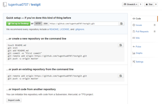 登录 github ,然后在右上角 + 号下拉列表里找到 New repository ,创建一个新的仓库。在 Repository name 填入 testgit ,其他保持默认设置,点击 Create repository 按钮,就成功地创建了一个空的Git仓库。