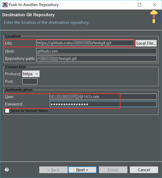 选中要发布的项目 --> 右击 --> Team --> Remote --> Push... ,粘贴 URI (也就是GitHub仓库地址, https://github.com/你的GitHub账号名称/Git仓库名称.git ),填写GitHub用户名 User 、密码 Password ,点击next。