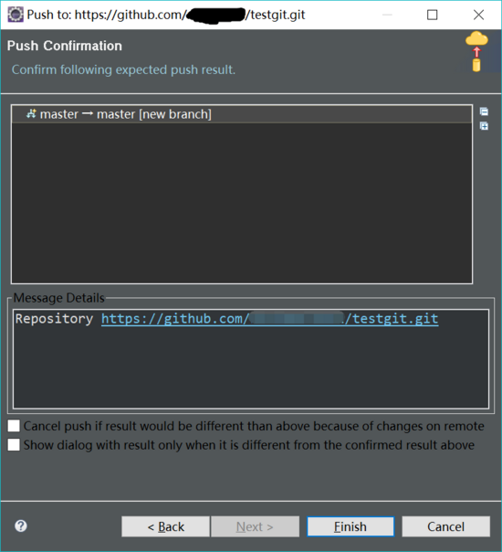 点击 Source ref 的下拉框,选择 master [branch] ,然后点击 Add Spec ,下方 Specifications for push 下面会出现要提交的分支信息,点击Next,再点击Finish,最后点击OK就完成了。