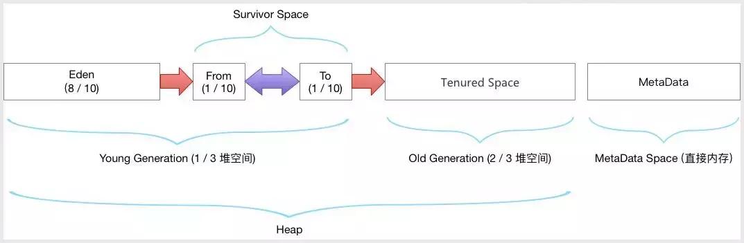-Xss:每个线程的栈大小-Xms:初始堆大小,默认物理内存的1/64-Xmx:最大堆大小,默认物理内存的1/4-Xmn:新生代大小-XX:NewSize:设置新生代初始大小-XX:NewRatio:默认2表示新生代占年老代的1/2,占整个堆内存的1/3。-XX:SurvivorRatio:默认8表示一个survivor区占用1/8的Eden内存,即1/10的新生代内存。-XX:MaxMetaspaceSize:设置元空间最大允许大小,默认不受限制,JVM Metaspace会进行动态扩展。