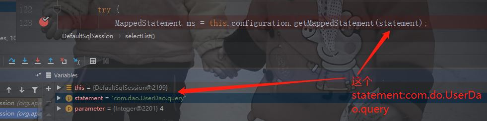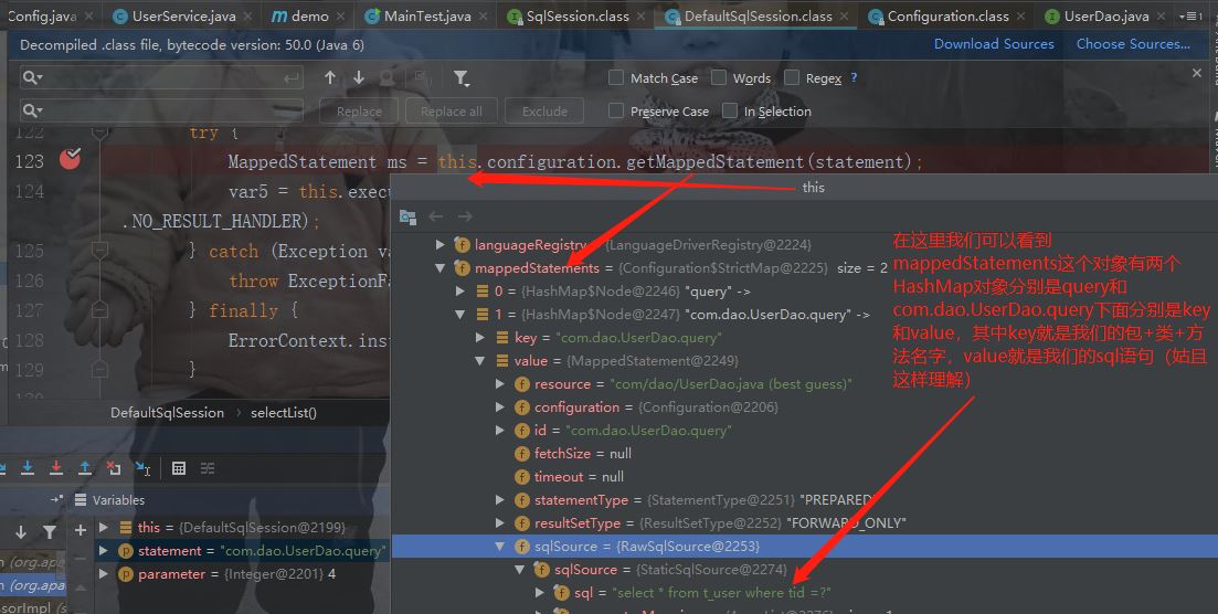 结论:再启动项目的时候,mybatis会进行初始化,这个初始化就是将我们的"包+类+方法名"作为key 和 sql语句作为value 的键值对形式赋给下面Map类型的mappedStatements