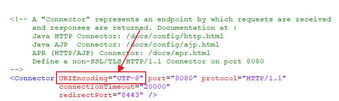 这种乱码主要发生在 GET 请求中,因为在 GET 请求中我们一般通过 URL 来传递参数,这个问题可以在代码中解决,但是太过于麻烦,因此一般我们直接在Tomcat配置中解决,修改 Tomcat的conf/server.xml 文件,修改 URL 编码格式,如下: