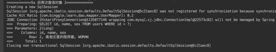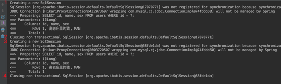 从图中的 1/2/3/4 可以看出每次 mapper 层的一次接口调用如 getOne 就会创建一个 session,并且在执行完毕后关闭 session。所以两次调用并不在一个 session 中,一级缓存并没有发生作用。开启事务,Controller 层代码如下:
