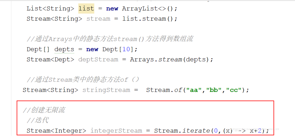 创建无限流 //迭代 Stream<Integer> integerStream = Stream.iterate(0,(x) -> x+2);