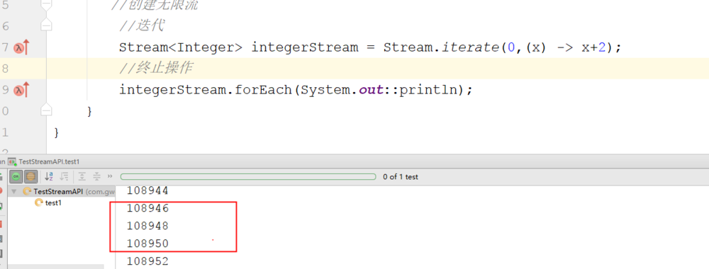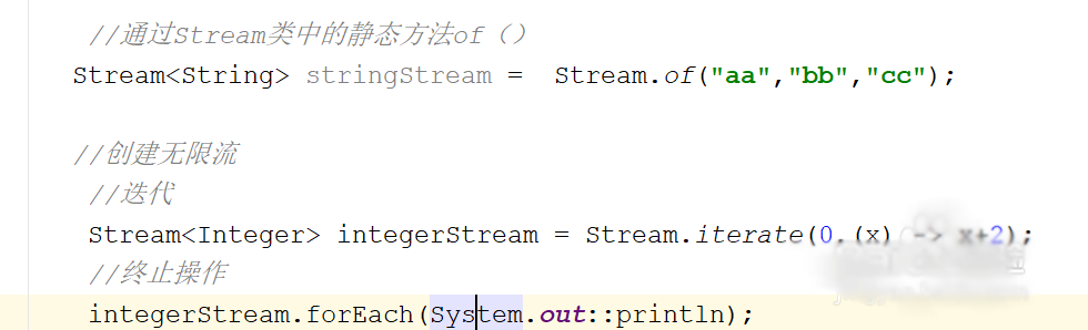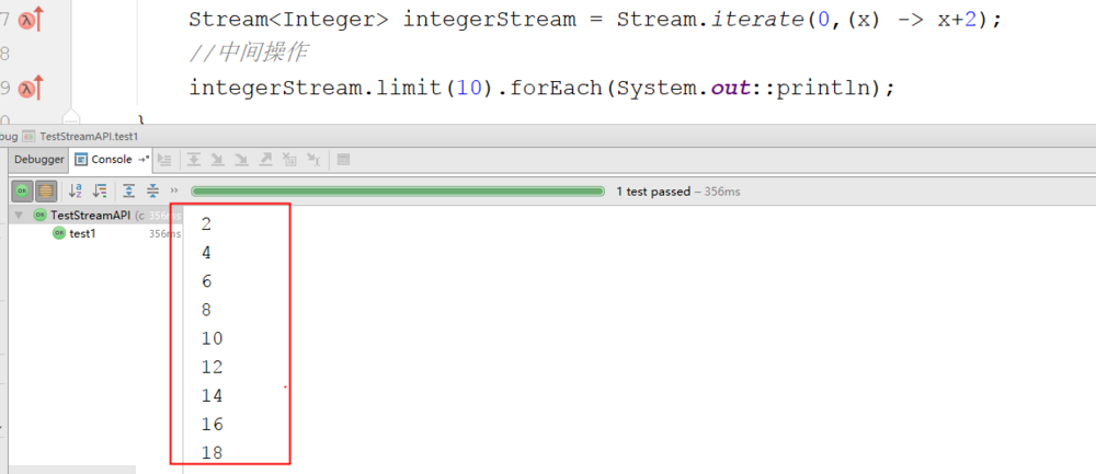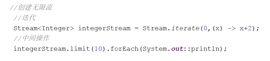 //创建无限流 //迭代 Stream<Integer> integerStream = Stream.iterate(0,(x) -> x+2); //中间操作 integerStream.limit(10).forEach(System.out::println);