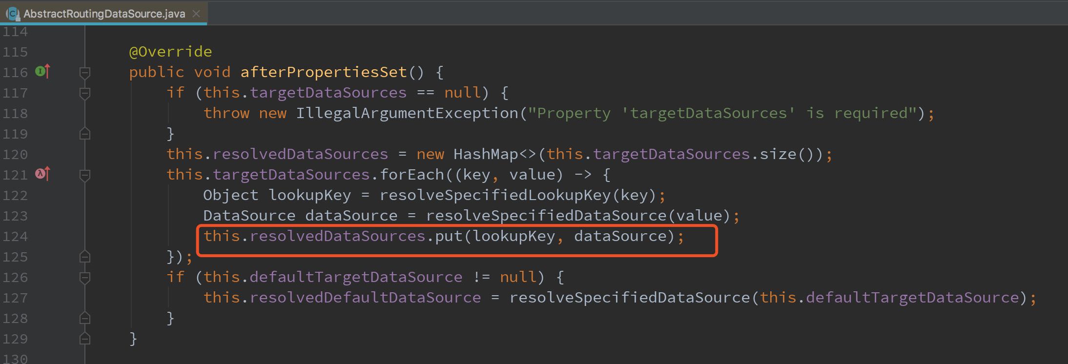 我们来看下 AbstractRoutingDataSource 的加载map 数据源的源码,只有在初始化的时候调用 afterPropertiesSet 去初始数据源map.