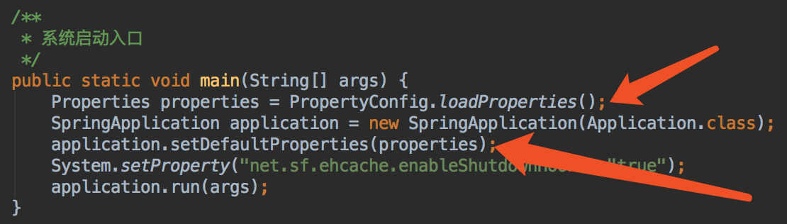 注意图中箭头指向的两行,构造了一个properties对象,然后将这个对象放到了springboot的启动对象application中,properties是一个类似map的key-value容器,springboot可以将其中的东西当做成原来application.properties中的内容一样,因此在properties对象的内容也就相当于写在了application.properties文件中。知道了这个之后就简单了,我们将原本需要写在application.properties中的所有配置信息写在数据库中,在springboot启动的时候从数据库中读取出来放到properties对象中,然后再将这个对象set到application中即可。上图中PropertyConfig.loadProperties()方法就是进行了这样的操作,代码如下: