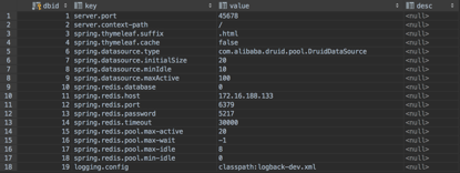 代码中,首先使用古老的jdbc技术,读取数据库t_config表,将表中的key-value加载到properties中,代码中profile是为了区分开发环境和生产环境,以便于确定从那张表中加载配置文件,数据库中的配置信息如下: