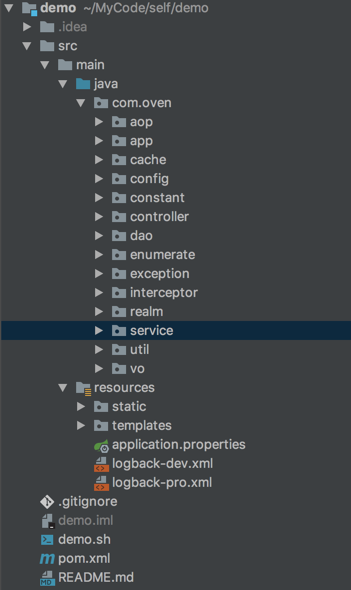 到现在都没有贴一个项目的目录结构,先来一张。目录中项目跟目录下的demo.sh就是启动脚本,当时从网上抄袭改装过来的,源代码出自那位大师之手我就不知道了,先行谢过。在部署到服务器的时候,如果服务器上安装好了jdk、maven、git,每次修改完代码,直接git pull下来,然后mvn package打包,然后直接./demo.sh start就可以启动项目,方便快速。慢着,忘记了,如果你提交到github中的application.properties中的数据源配置信息是开发环境的话,那么你在打包之后,target/resources中的application.properties中的数据源需要改成开发环境才可以启动。当然如果你嫌麻烦,可以直接将开发环境的数据源配置push到github中,安不安全就要你自己考虑了。
