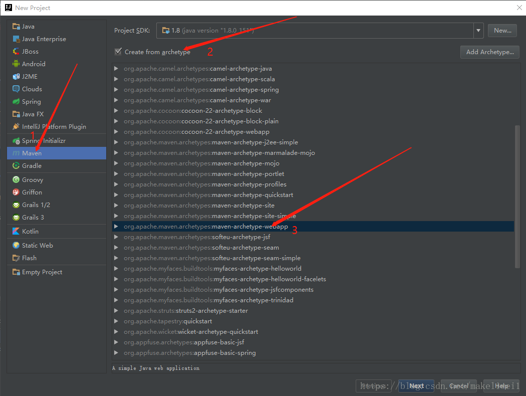 (1)、第一步是创建一个由Maven原型的项目,根据图片上的步骤一次选择Maven—–>create from archetype—->maven-archtype-webapp