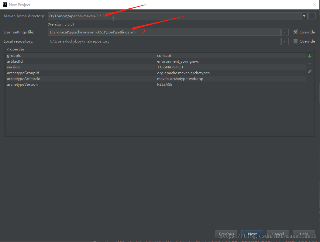 (3)、在位置1处选择我们maven安装的目录,在位置2处选择settings.xml的路径(我只是设置了一次之后就是默认的了)