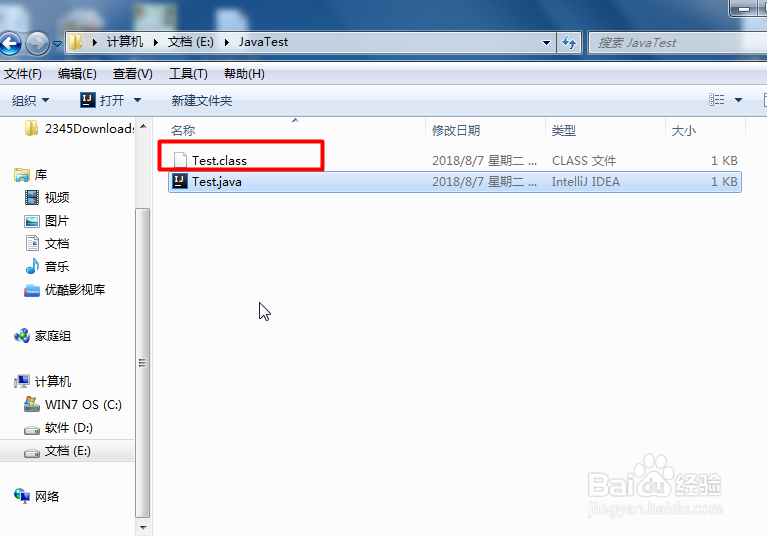 最后可以看到E盘下的JavaTest文件夹下生成一个Test.class文件,如图所示: