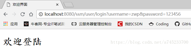 访问地址:http://localhost:8080/ssm/user/login?username=zwp&password=123456,如果出现下面页面则代表映射成功。