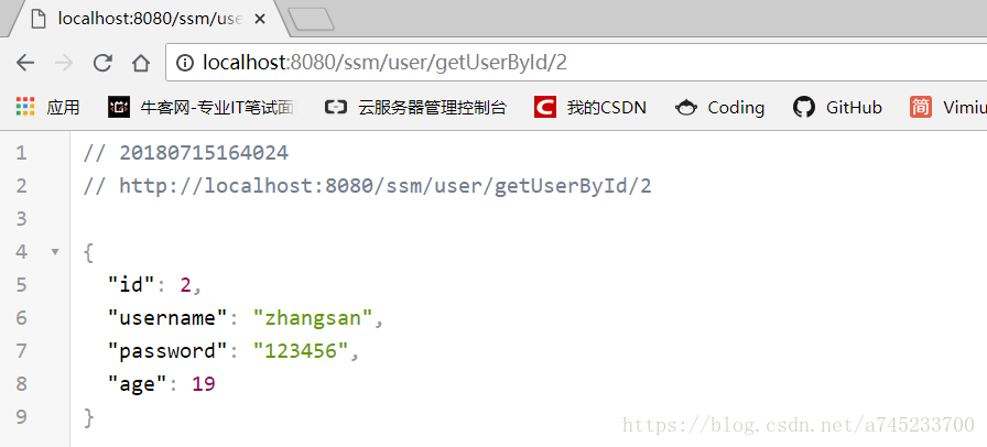 (4)部署项目,输入地址:http://localhost:8080/ssm/user/getUserById/2,出现下面响应结果,则表示整合成功了。