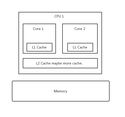 举个简单的例子: 假设现在存在两个Core,分别是CoreA和CoreB并且他们都拥有属于自己的L1Chace和共用的L2Cache。同时有一个变量X的值为1,该变量已经被加载在L2Cahce上。此时CoreA执行运算需要用到变量X,先去L1Cache寻找,未命中,继续在L2Cache寻找,命中成功,将X=1载入L1Cahce,再经过一系列运算后将X修改为2并写入L1Cache。于此同时CoreB刚好也需要X来进行运算,此时他去自己的L1Cahce寻找,未命中,继续L2Cache寻找,命中成功,将X=1载入自己的L1Cache。此时就出现了问题,CoreA明明已经将X的值修改为2了,CoreB读取到的依然是X=1,这就是内存可见性问题。