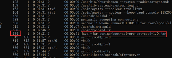 根据运行的目录,找到PID,例如图中的 734 。然后使用