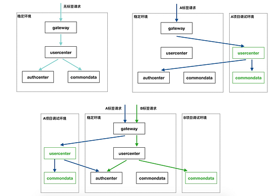 实现的效果如图所示,在头上带上标签的请求会在经过网关和各个应用时进行标签判断流量应该打到哪一个去,而每一个应用自己本身的标签是通过eureka上的matedate实现的。