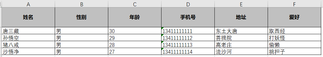 String[] strs = new String[] { "姓名", "性别", "年龄", "手机号", "地址","爱好" };