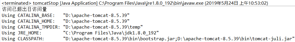 String command = "D:\\apache-tomcat-8.5.39\\bin\\shutdown.bat";// 关闭tomcat命令
