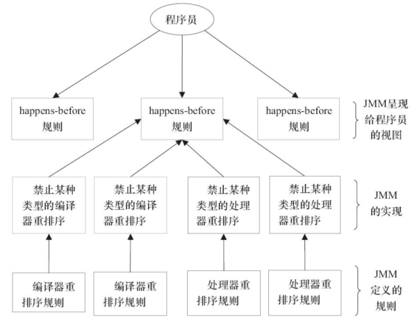 如图所示,一个happens-before规则对应于一个或多个编译器和处理器重排序规则。