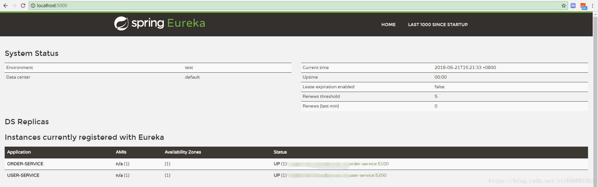 使用IDEA启动eureka-service服务,本地访问 http://localhost:5000/ 即可看到注册中心内容。