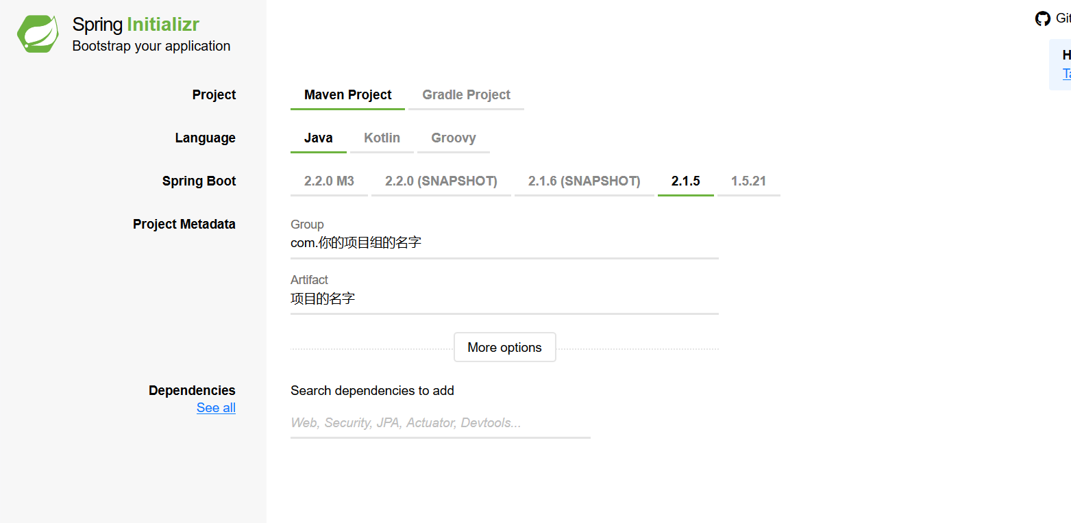 点开这个网站,创建一个Springboot项目,如下图,这里用的是2.1.5,学技术嘛,就是要学新的。