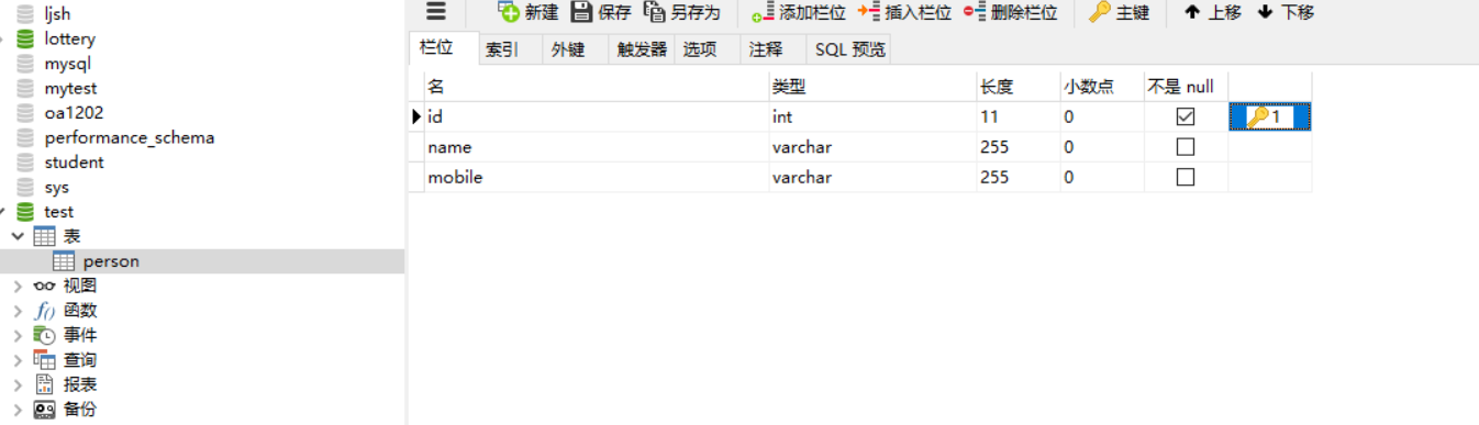 打开mysql数据库创建一个叫test的数据库之后创建person表,这里使用的是Navicat百度有破解版,会命令用命令行也行,如下图,记得设置主键自增,然后随便加几个数据以便之后查询。