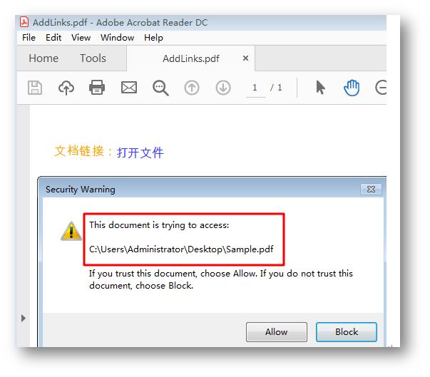 PdfFileLinkAnnotation fileLinkAnnotation = new PdfFileLinkAnnotation(rect,"C:\\Users\\Administrator\\Desktop\\Sample.pdf");