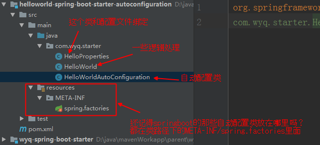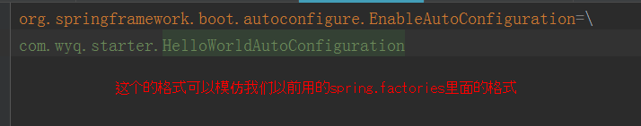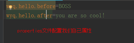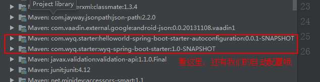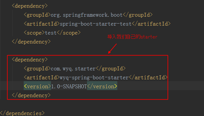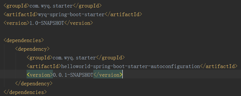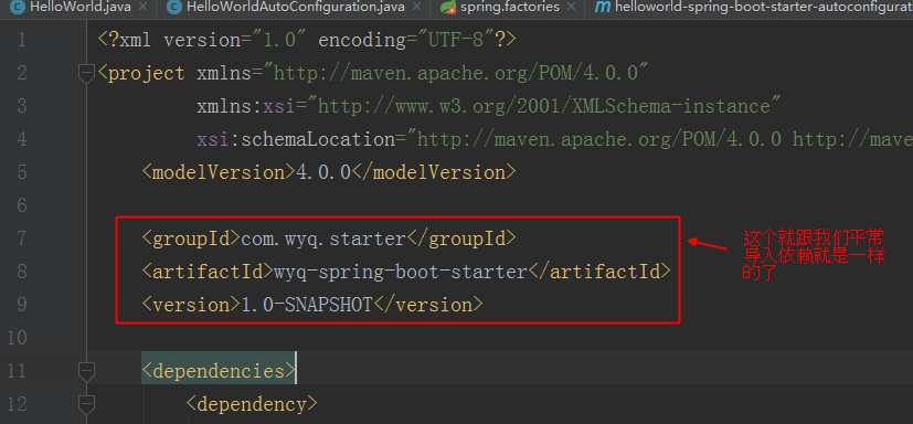到此为止,一个简单的HelloWorid的starter就做出来了,我们只需要在我们的项目中导入那个starter(也就是前台唯一的作用)的依赖,就可以了,看看我的starter的坐标(还要记住,properties文件配置的@ConfigurationProperties(prefix = "wyq.hello"),这个prefix是可以在我们项目里面配置文件配置属性的哦~~)