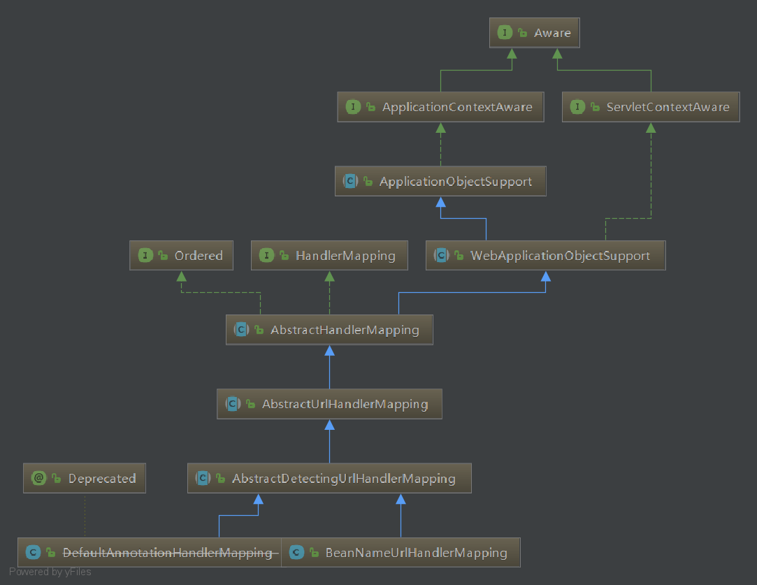 DispatcherServlet.properties种指定了两个默认的HandlerMapping:BeanNameUrlHandlerMapping、DefaultAnnotationHandlerMapping,这两者的类继承图如下(我们暂时只关注DefaultAnnotationHandlerMapping)