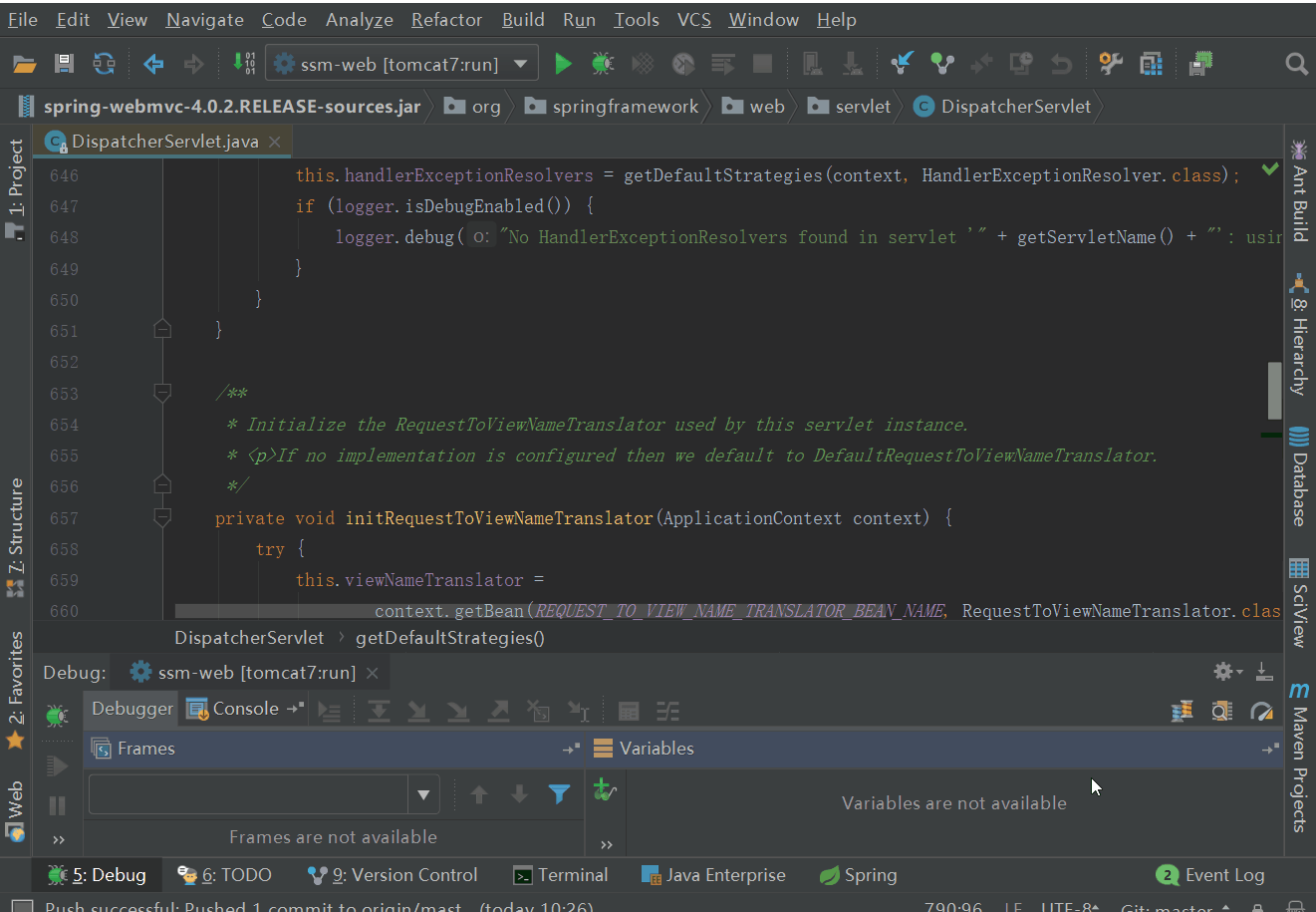 可以看到,初始化顺序就是我们上面说的,不是我个人的意淫;此时的DefaultAnnotationHandlerMapping中有我们自定义的MyInterceptor。初始化过程我们需要关注的就是上述这些,下面我们一起看看具体请求的过程