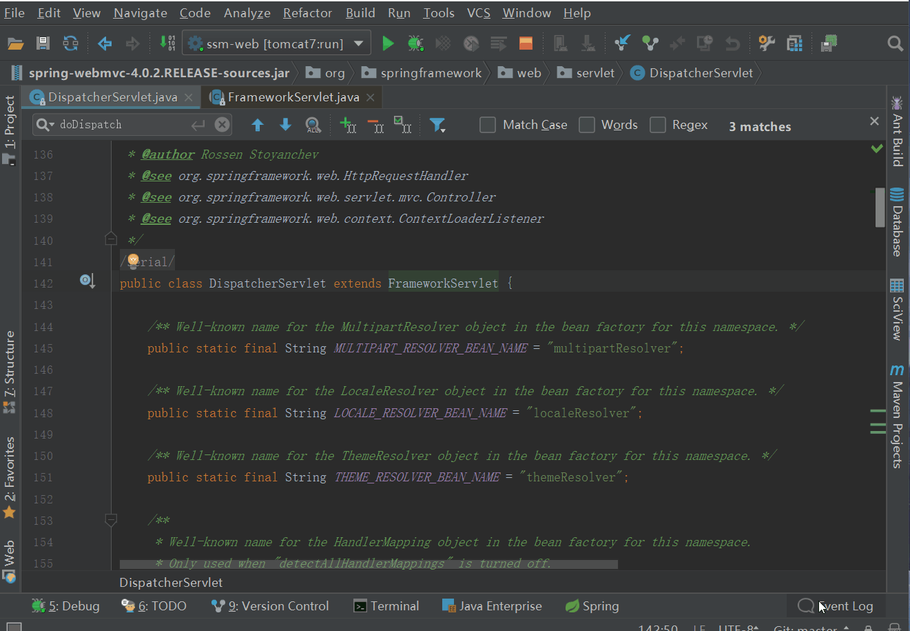 请求从servlet的service开始,一路到DispatcherServlet的doDispatch,如下图