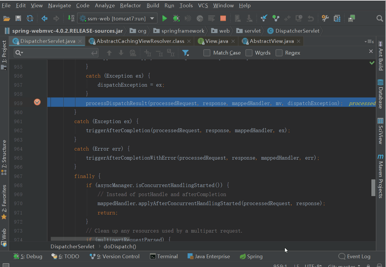 handlerMapping具体如何找到匹配当前url的handler(一般而言就是我们的controller)、handlerAdapter具体如何回调真正的handler,有兴趣的可以自行去跟下,我就不跟了。我们具体看下processDispatchResult(processedRequest, response, mappedHandler, mv, dispatchException); 这个与我们最初的疑问有关