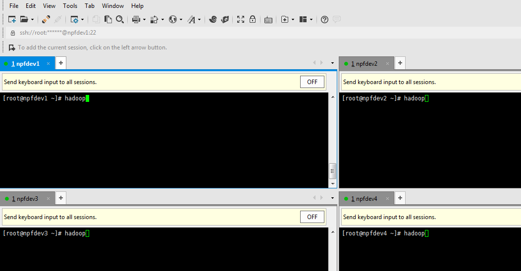 首先分别在npfdev2和npfdev3和npfdev4机器上,建立/usr/local/hadoop目录,然后在npfdev1上分别执行下面命令:
