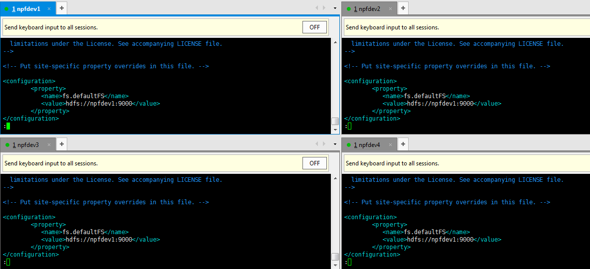 6. 将npfdev1机器上的hadoop复制到npfdev2和npfdev3和npfdev4机器上。使用下面的命令: