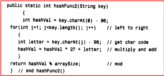 还有就是当哈希表填充得越满,效率也就越低,所以当哈希表快满了之后就要扩展,而java中数组是不能直接进行扩展的,需要再新建一个数组,然后想办法将这个哈希表中的数据复制到新的数组中,注意,这里不能直接复制,因为新的数组的容量和原来的数组不一样,那么原来哈希表中所有的数据必须要重新哈希化,然后放入到新的数组中,非常耗时....