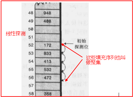 看名字线性就知道是从前往后寻找空的位置,举个很简单的例子,当一个字符串经过运算对应于数组下标为52,然而此时52这个位置上已经有了数据,那么就尝试放到53的位置,假如53的位置也已经放了数据,那就放到54位置,就这样一直往后慢慢找,直到找到一个空的位置就把数据放进去;而此时找的次数越多,假如已经找到56的位置,那么从53到56这么多位置叫做填充序列,当填充序列很长的时候,我们就称为原始聚集,下图所示: