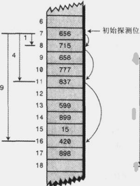 这里填充序列的中有5个填充单元,我们也可以说步数为1,每次探测都是前进一步;我们可以知道当探测的次数越多的时候,说明聚集越严重,下一次再想添加到这个位置的数据的效率就越低;
