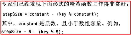 于是我们准备了两个哈希函数,一个哈希函数就是我们上面说到的可以产生对应的数组下标,另外一个哈希函数可以产生步长,其实就是多个数据放在同一个位置产发生冲突,就用这个哈希函数再次哈希化产生一个步长,根据这个步长进行探测就可以了,而不用每次都从第一个步长开始;比如下面就有一个产生步长的哈希函数,我们可以知道步长的范围是1-constant,注意步长不能为0,否则就原地踏步了。。。