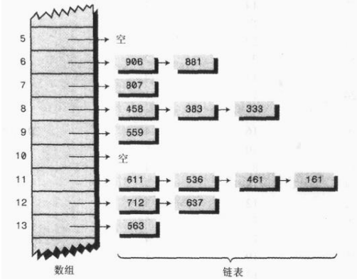 可以看到上面的开放地址法有点麻烦,需要找到探测序列真的是日了狗了,麻烦的我都不想看了,如果可以不用这么麻烦那该多好呀,ok,那就用链地址法吧!就类似下面这样的结构,原始的数组中不直接保存数据,每个位置只是保存第一个数据的引用,通过该位置第一个引用就可以取到后面所有的数据!如果链表太长遍历起来就比较费劲,可以转为红黑树效率就高了很多;
