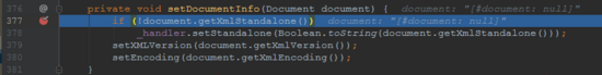 在包路径 com.sun.org.apache.xalan.internal.xsltc.trax 下, DOM2TO 类代码的的第377行,有个 setDocumentInfo 方法,我们鼠标左键点进去,在该行加个 Debug 断点。