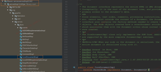可以发现,这里有两个 CoreDocumentImpl,一个是我们的 JDK1.8的,一个是属于 xerce的,而且确实在依赖的 maven jar 包中发现了 xercesImpl-2.4.0.jar,这个 jar包就是需要排除的 jar包。