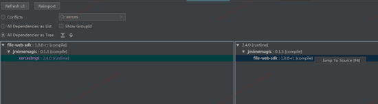 清晰明了,原来这个罪魁祸首是被 file-web-sdk 带进来的,我们右键选择 Jump To Source 或者 F4 定位到这个 jar 在 pom.xml 的依赖引入位置,如下图所示,我们通过 exclusion 标签排除 xercesImpl 的引入即可。