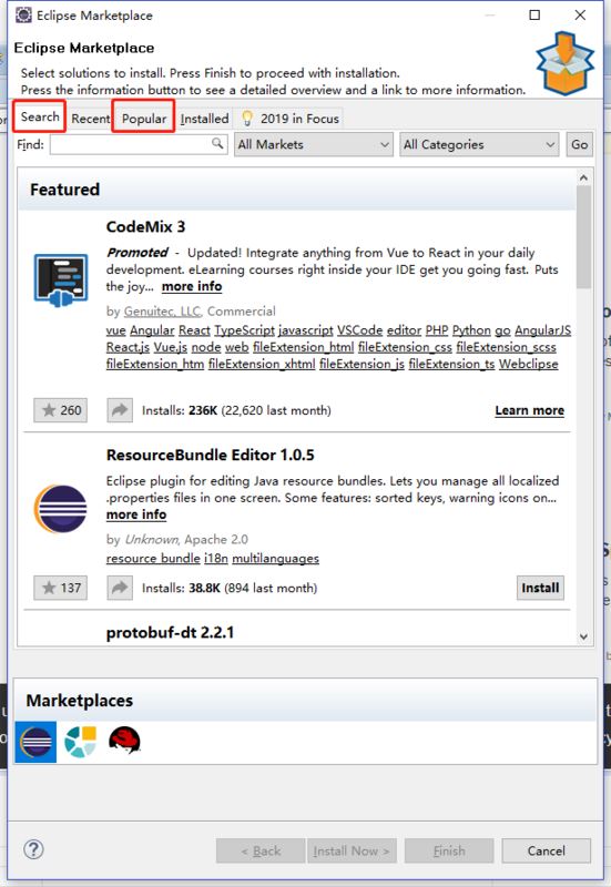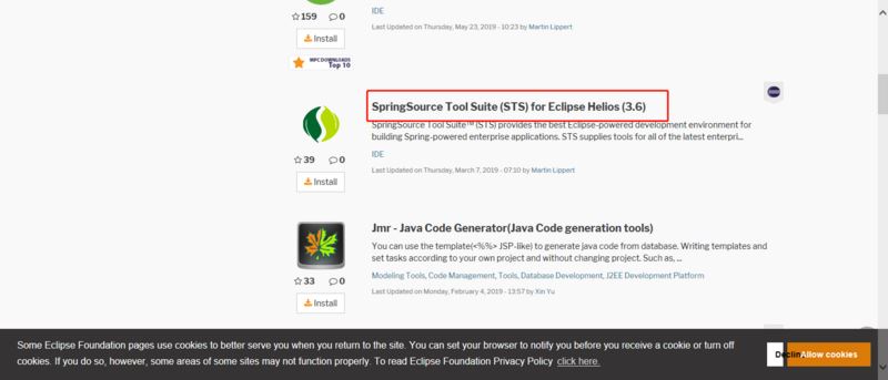在eclipse中的商店自动下载安装TST,具体步骤为:Help -> Eclipse Marktplace,选择Search或者Popular,搜索Spring Tool Suite,下载插件。