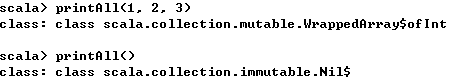 你可以使用对象的getClass方法来确定Scala为你自动赋值的类型,如当需要了解可变参数的工作流程时,可以调用getClass方法,得知不同情况,类型也不相同